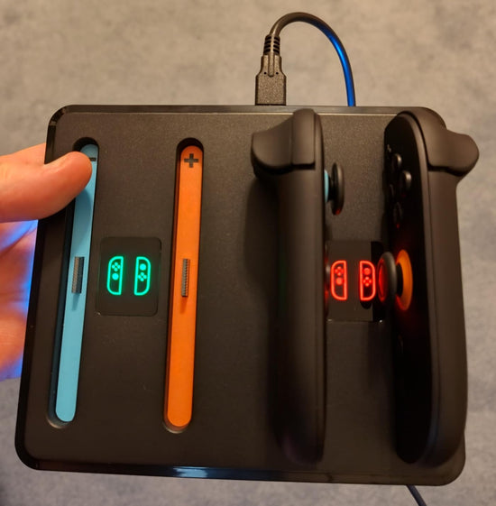 This vertical stand holds all my Joy-Cons without taking up much room. The red and green light bars are bright but not distracting, and the game card slots at the base are a nice bonus. Much neater than having controllers scattered around the TV.